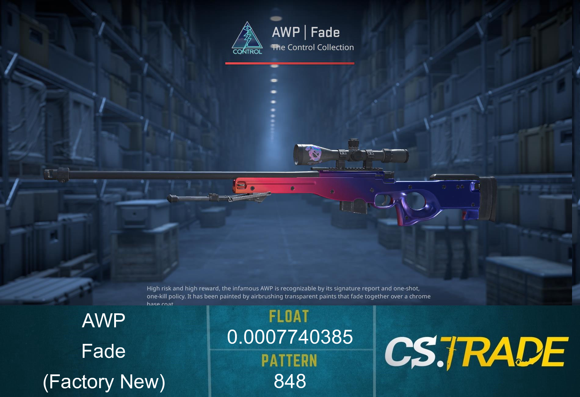 AWP | Fade skin float value ranges from 0.00 to 0.08 which makes it available in the following wear conditions: Factory New, Minimal Wear.