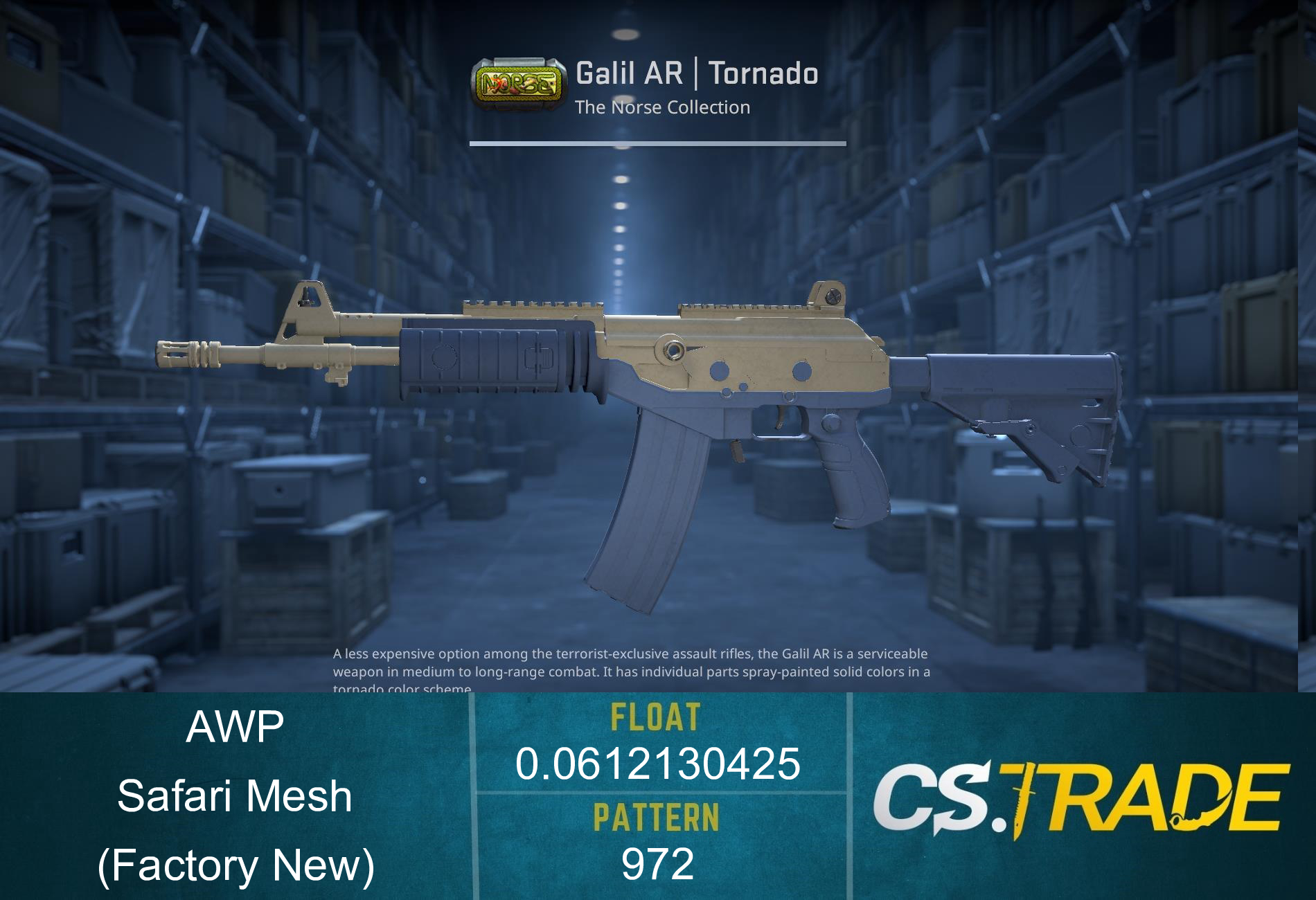 AWP | Safari Mesh finish style is Spray-Paint with finish catalog equal to 72. It's unique flavor text is: 'A predator is a predator, no matter the environment'.