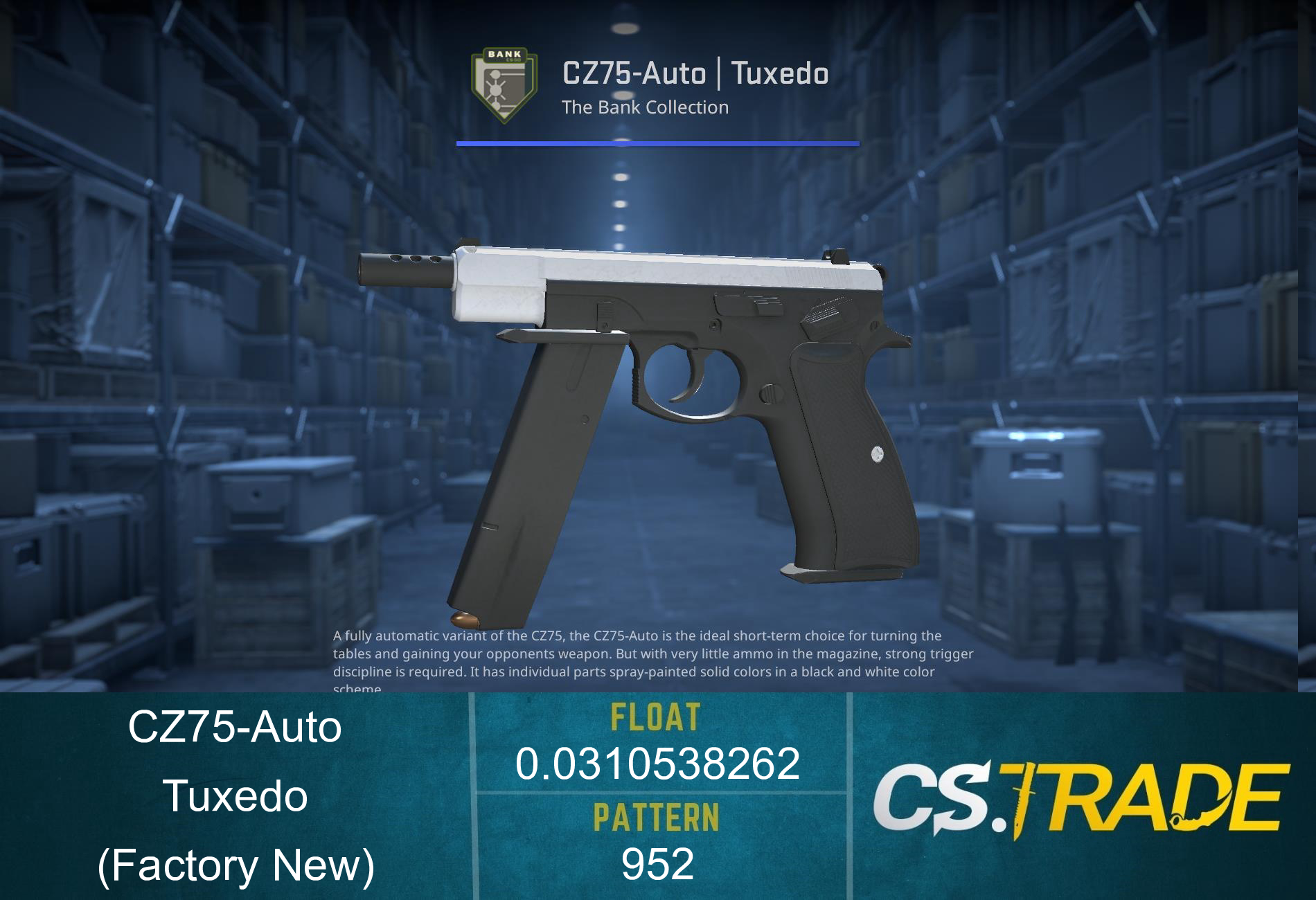 The CZ75-Auto | Tuxedo is a classy skin featuring a black and white 'tuxedo' design. Introduced in the Arms Deal 3 Collection, its simplistic yet elegant design quickly made it a favorite among players. Its value fluctuates on the market, but it has remained relatively high due to its rarity and demand.