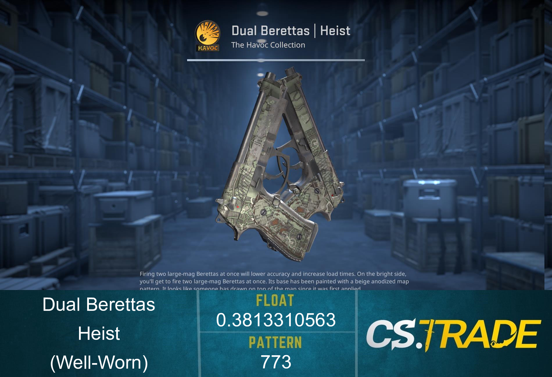The 'Dual Berettas | Heist' skin is a valuable and esteemed item in CS:GO's vast arsenal. Its design, featuring a sleek metallic finish, reminiscent of a high-stakes heist, provides a visual appeal that is unparalleled. This skin has witnessed its use in several high-profile tournaments and has been a part of winning strategies. In the trading market, the 'Dual Berettas | Heist' is often traded for its aesthetic appeal and relative rarity. It serves as a trophy for collectors and a tool for professional gamers.