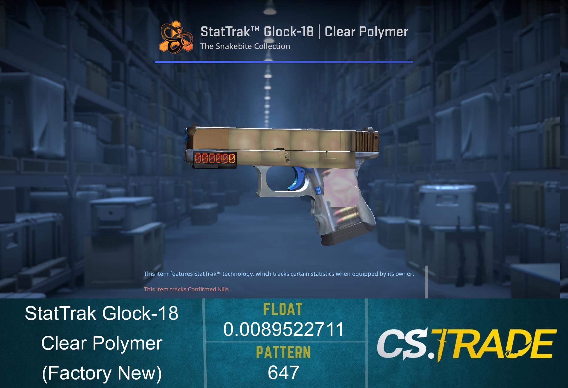 Glock-18 | Clear Polymer skin float value ranges from 0.00 to 1.00 which makes it available in the following wear conditions: Factory New, Minimal Wear, Field-Tested, Well-Worn, Battle-Scarred.